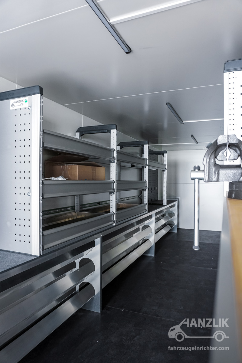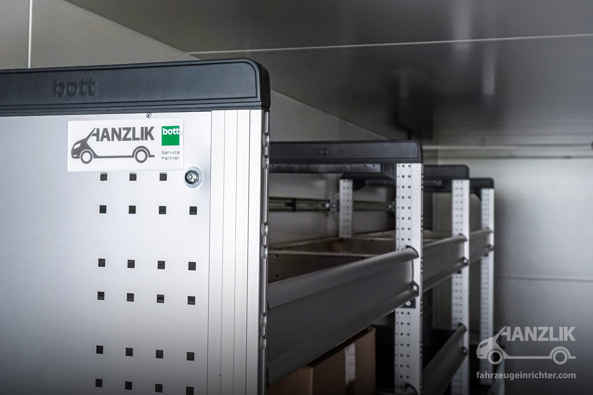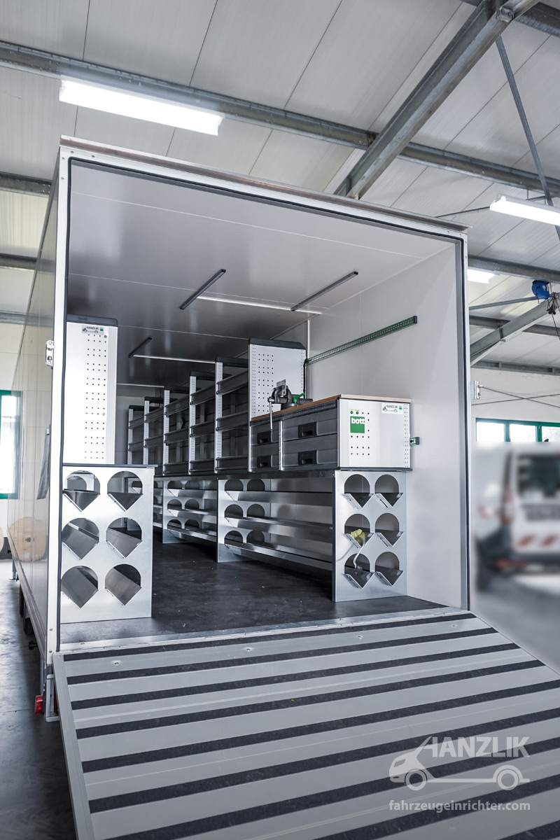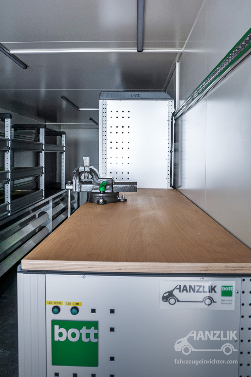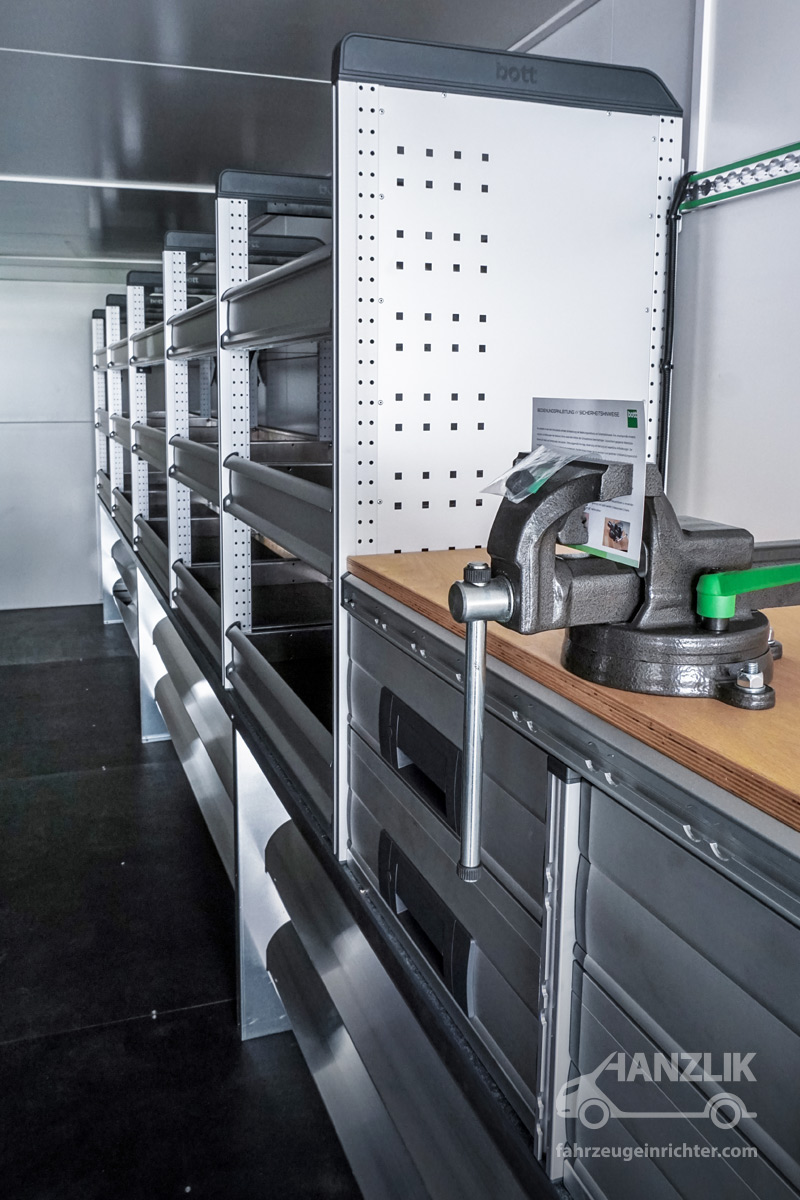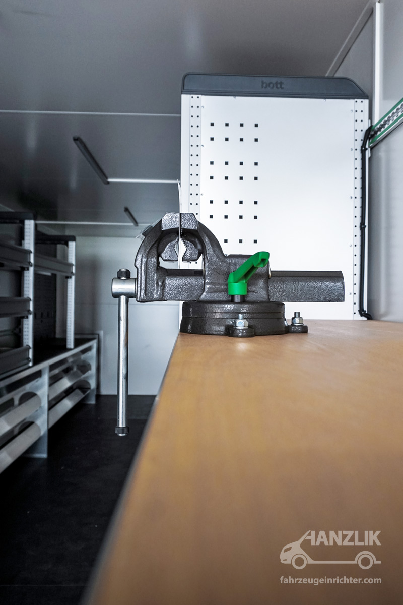 Verbaut sind bott vario³ Schränke mit Klappenböden für Anschlussteile, ein Schrankelement mit Schubladen für Werkzeuge sowie eine Arbeitsplatte mit Schraubstock. Alles ist sicher verstaut und jederzeit einsatzbereit.