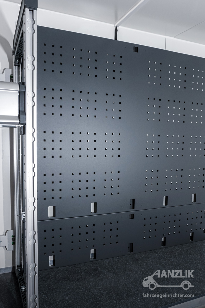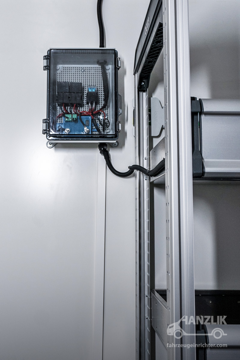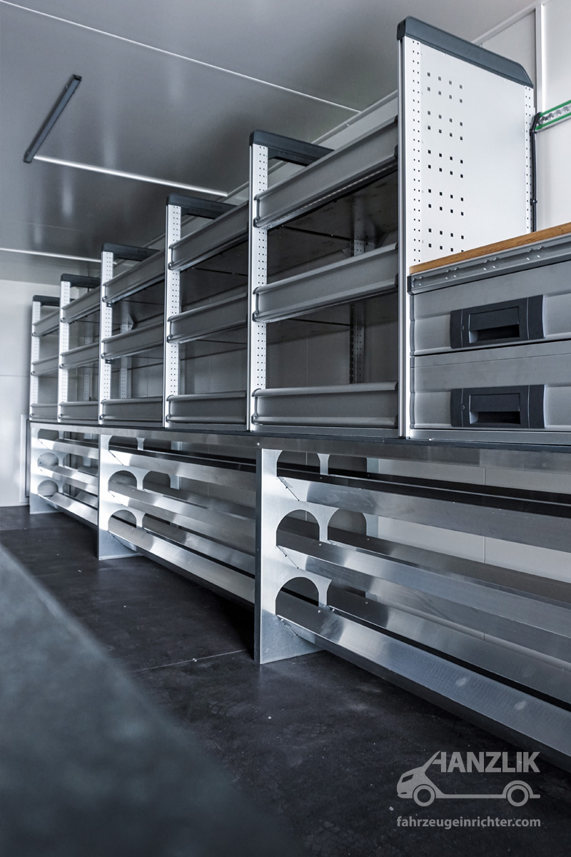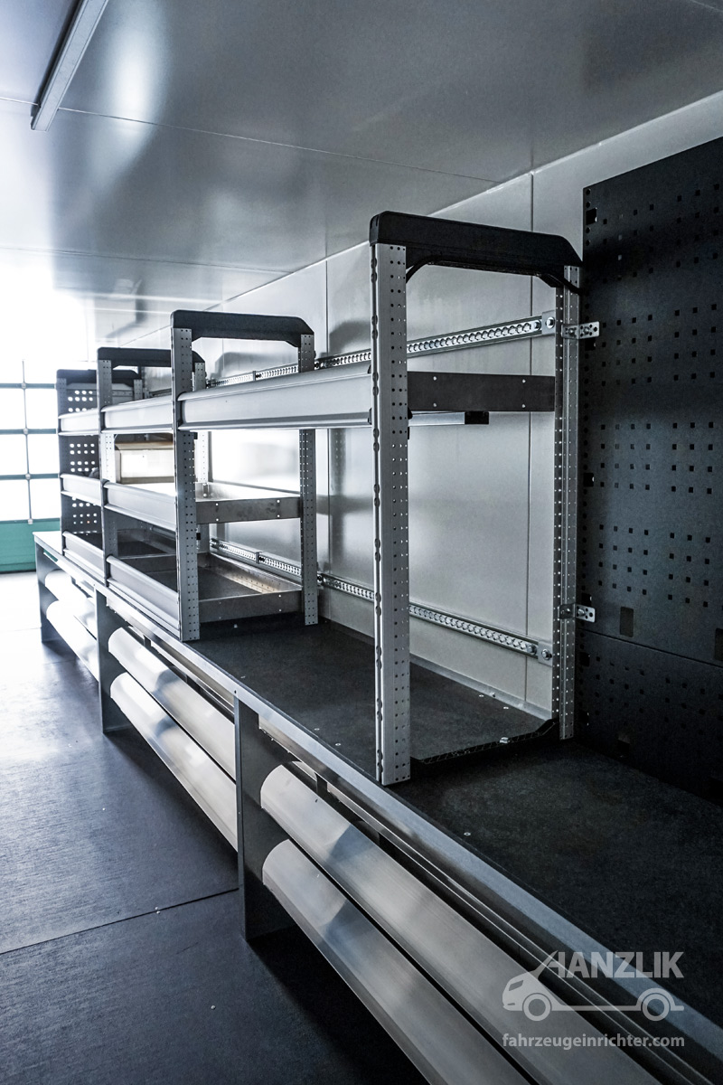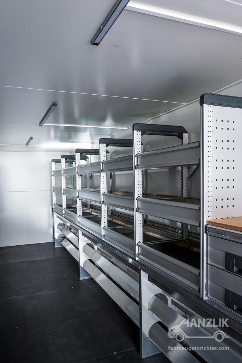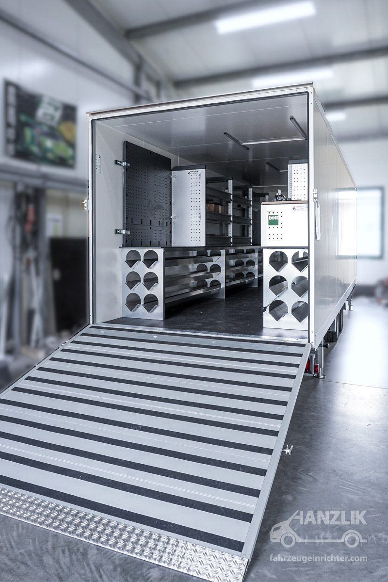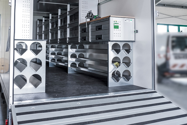 Verbaut sind bott vario³ Schränke mit Klappenböden für Anschlussteile, ein Schrankelement mit Schubladen für Werkzeuge sowie eine Arbeitsplatte mit Schraubstock. Alles ist sicher verstaut und jederzeit einsatzbereit.