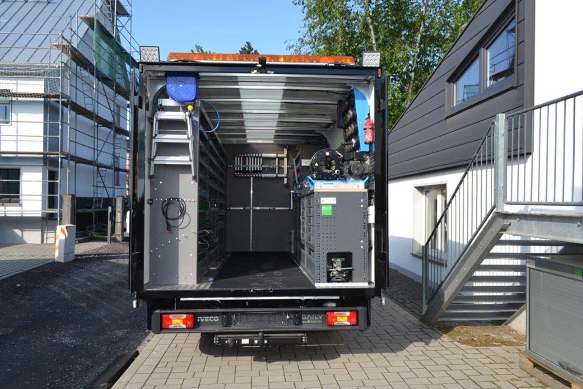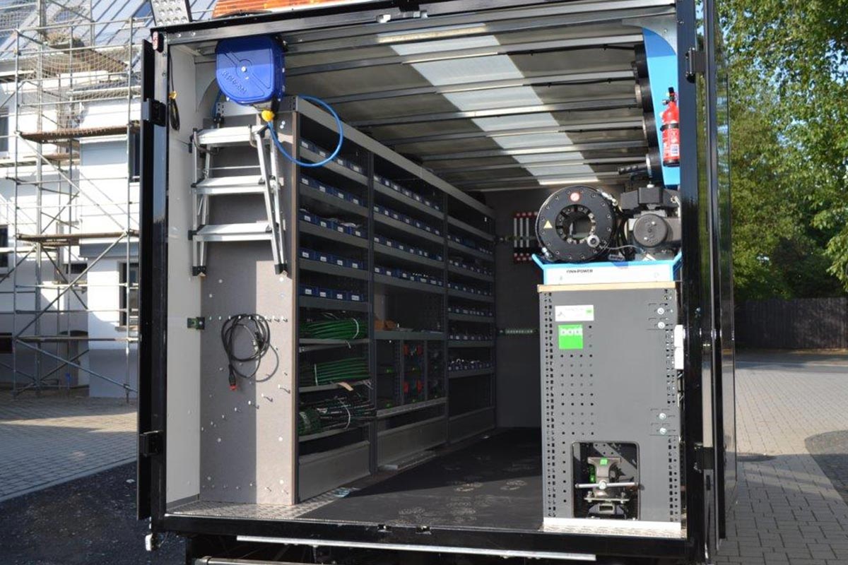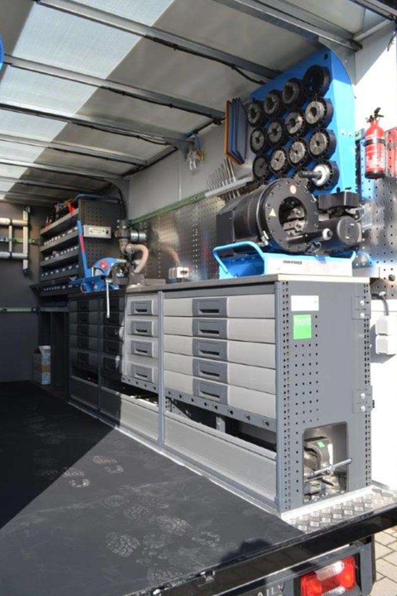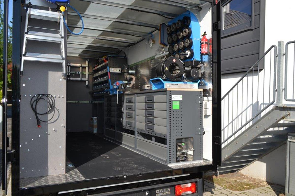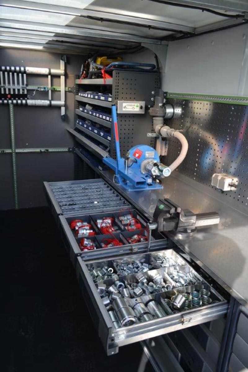 Alles sauber sortiert und griffbereit: Für den mobilen Service im Bereich der Hydraulik und Druckluft realisierten wir für unseren Kunden eine Fahrzeugeinrichtung inklusive Technik und mobiler Stromversorgung.