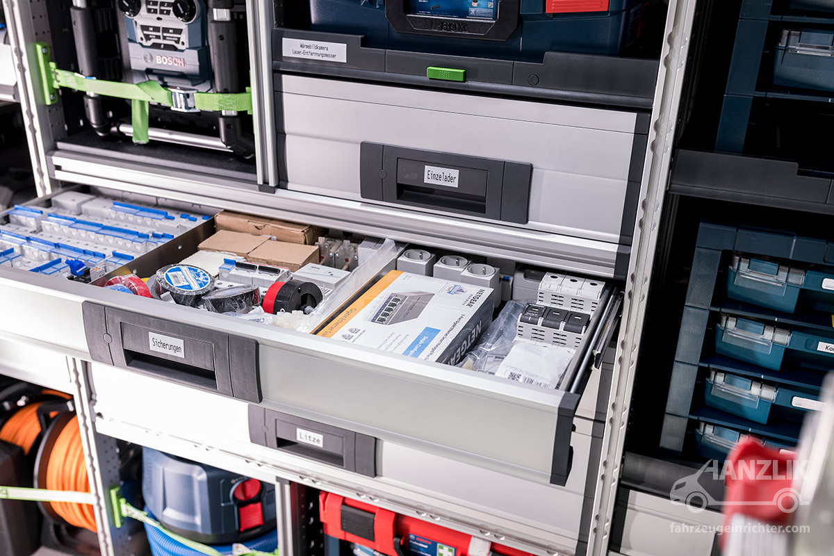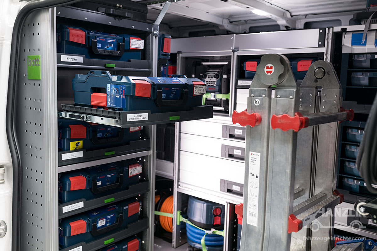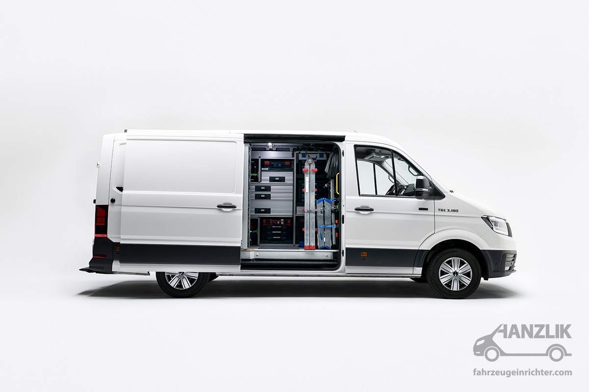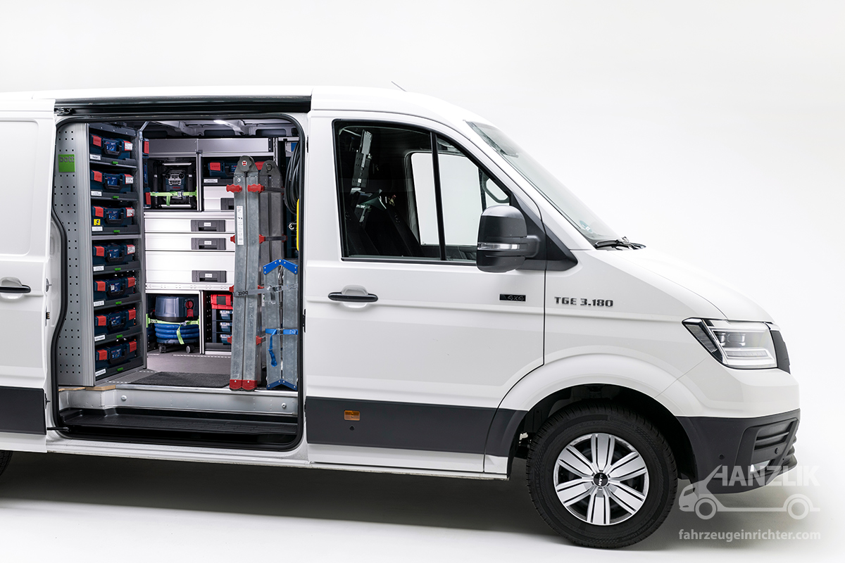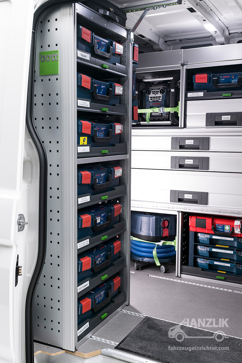 Dieser MAN TGE mit der bott vario³ Fahrzeugeinrichtung wurde von unserem Kunden mit allem ausgestattet, was für die Installation von Photovoltaik-Anlagen benötigt wird.