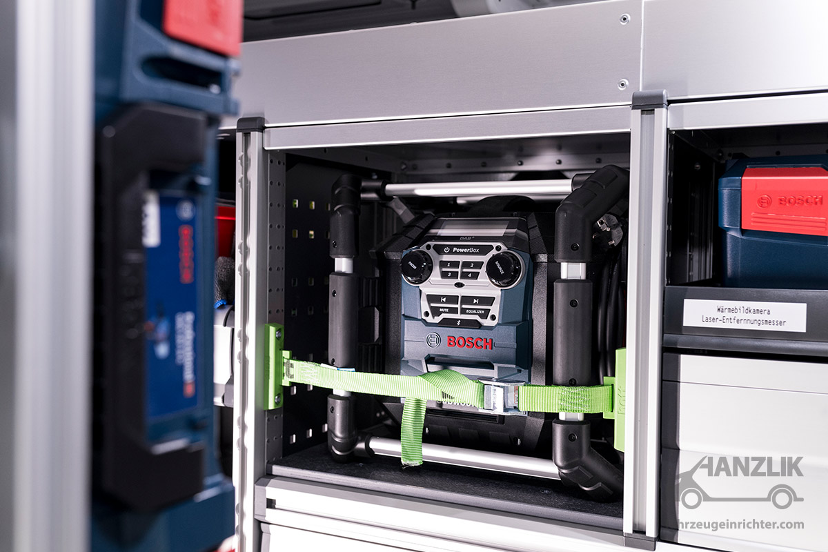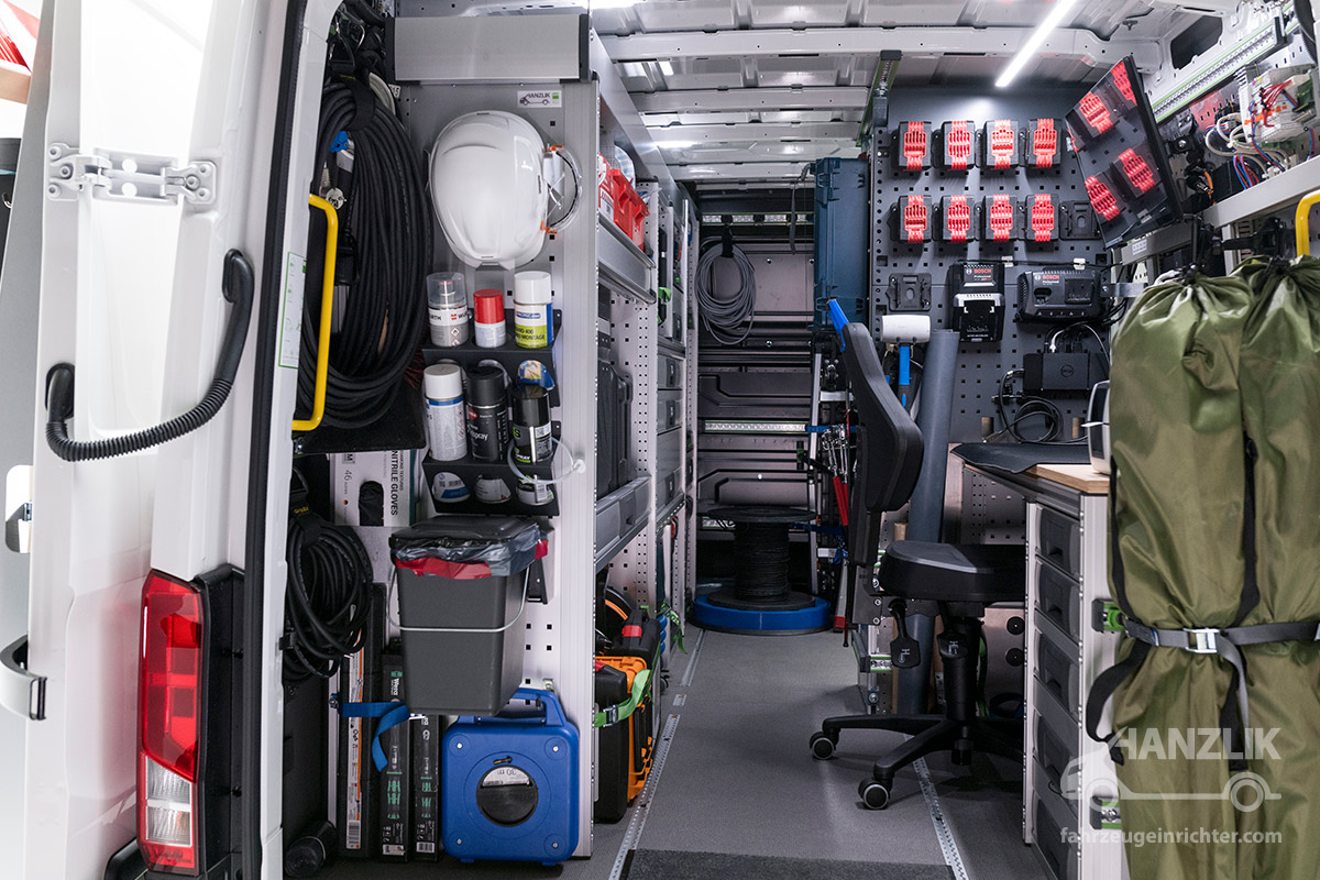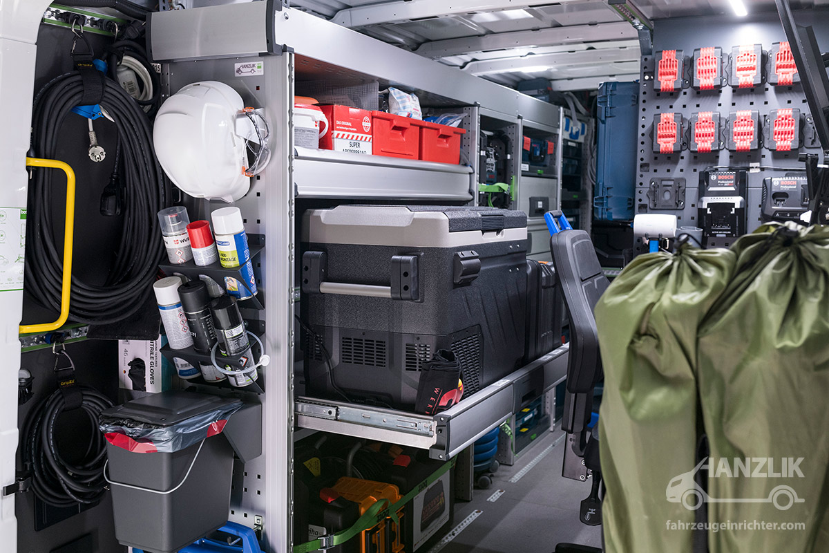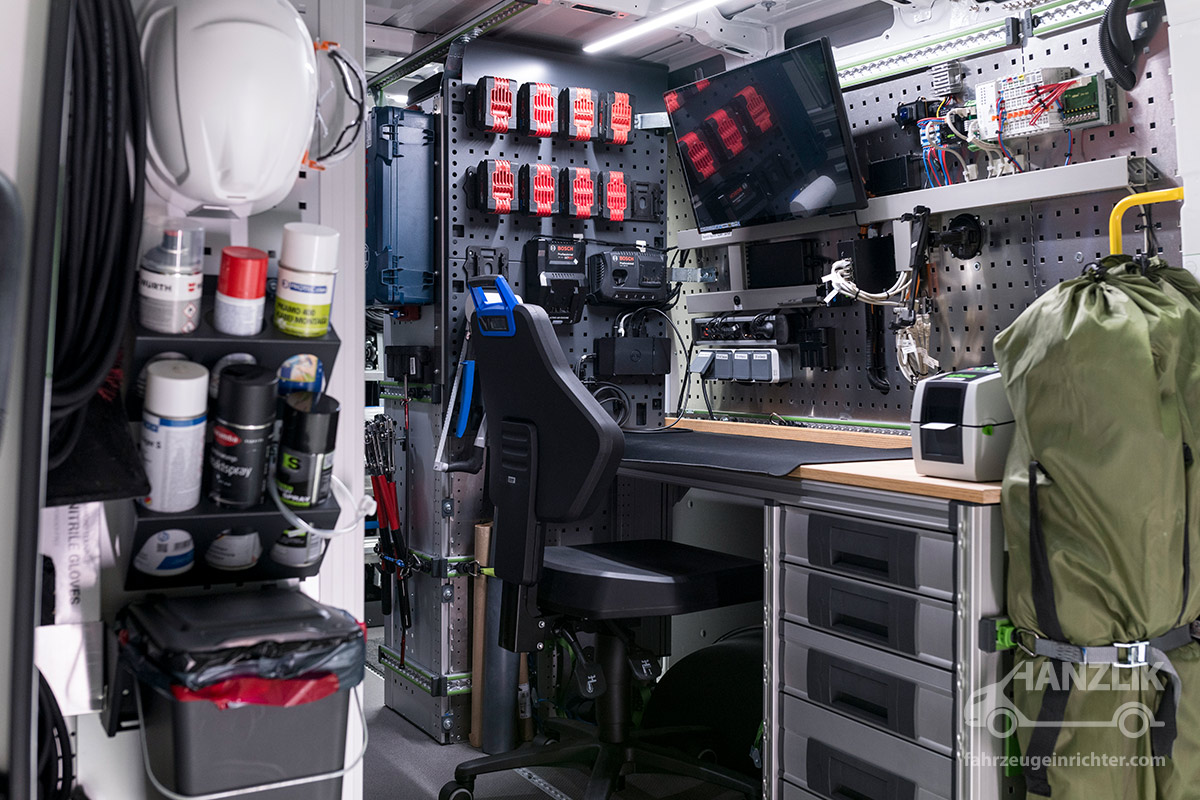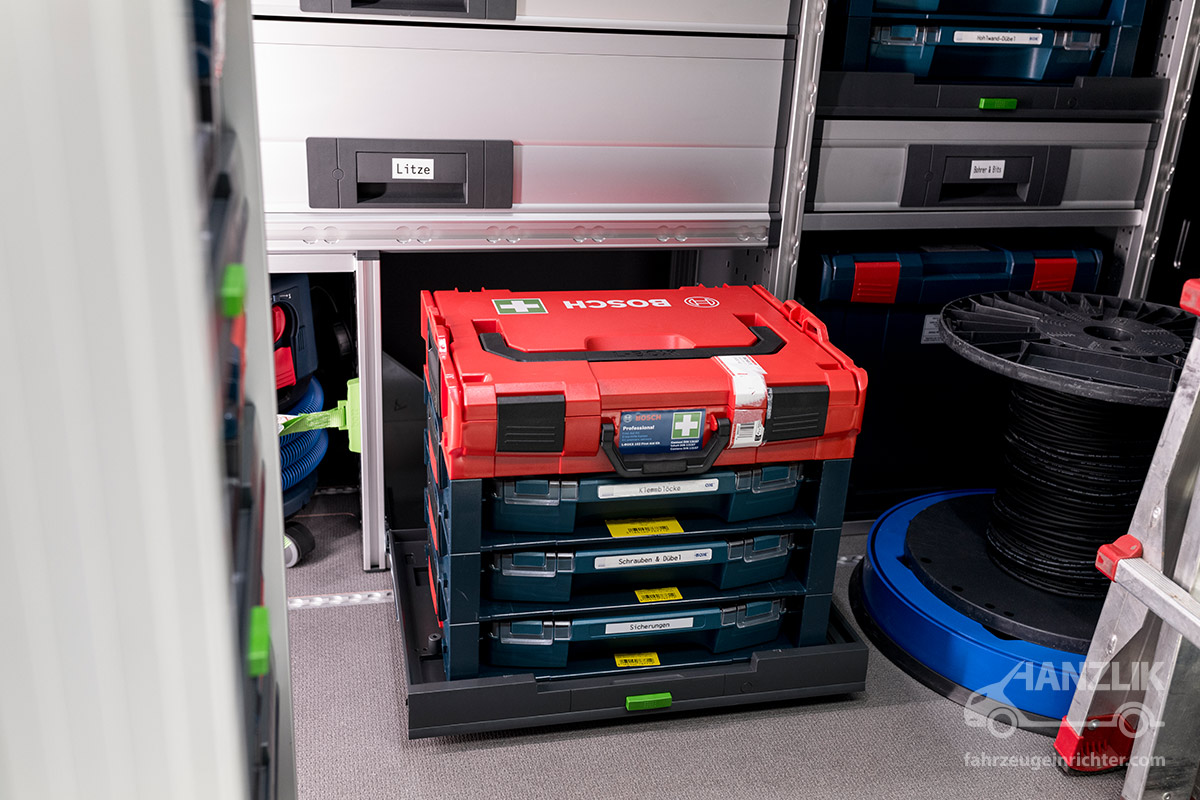 Dieser MAN TGE mit der bott vario³ Fahrzeugeinrichtung wurde von unserem Kunden mit allem ausgestattet, was für die Installation von Photovoltaik-Anlagen benötigt wird.