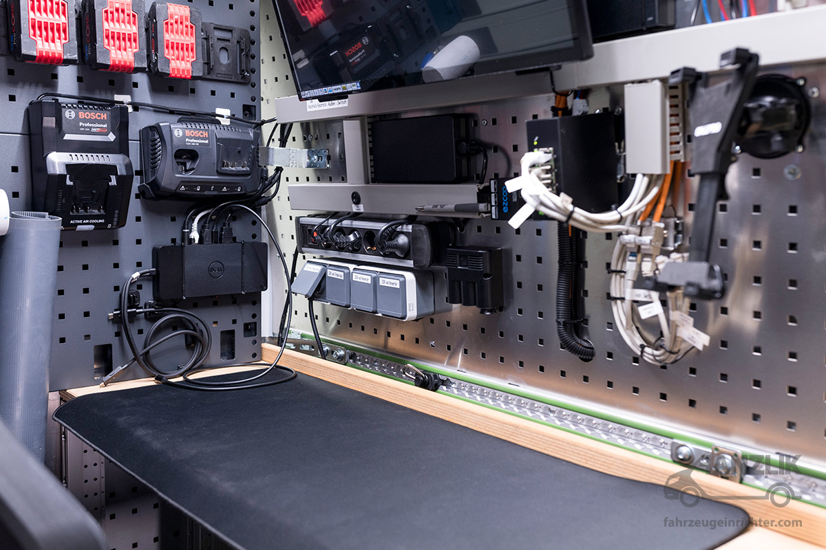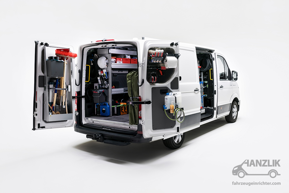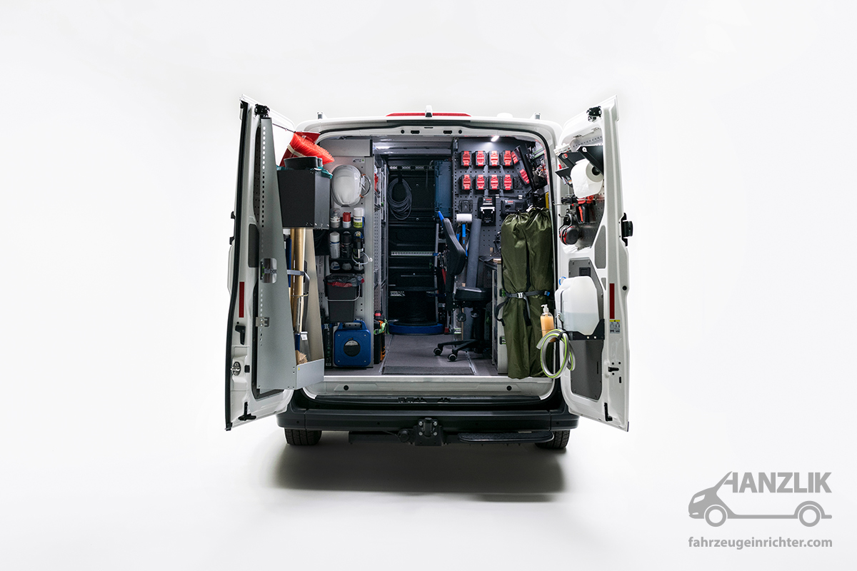 Für verunreinigte Arbeitsmaterialien wurde an der Hecktür ein Gerätehalter verbaut, dieser hält Schmutzpartikel z.B. von der Bodenfläche im Fahrzeug fern. Die Hygienestation mit Wassertank sorgt dafür, dass nach Außenarbeiten bedenkenlos an den sensiblen Arbeitsplatz im Fahrzeug gewechselt werden kann.