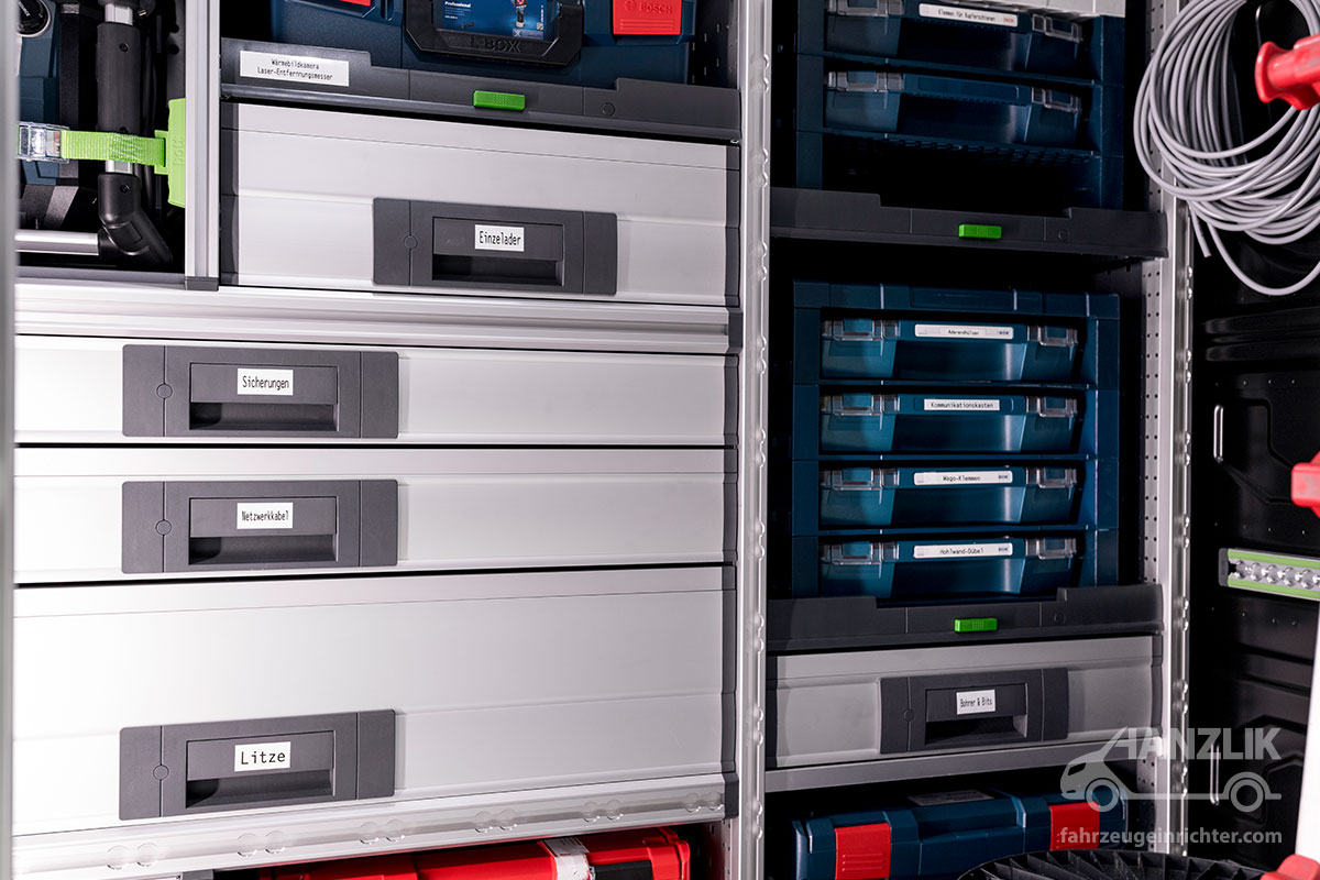 Vorhandene Koffer und Gerätschaften wurden zuvor vermessen, die Anordnung und Größen der Schubladen und Ablagen entsprechend berücksichtigt.