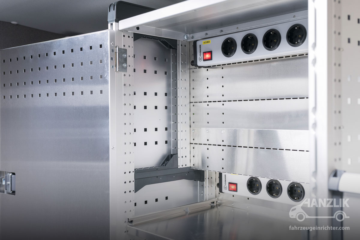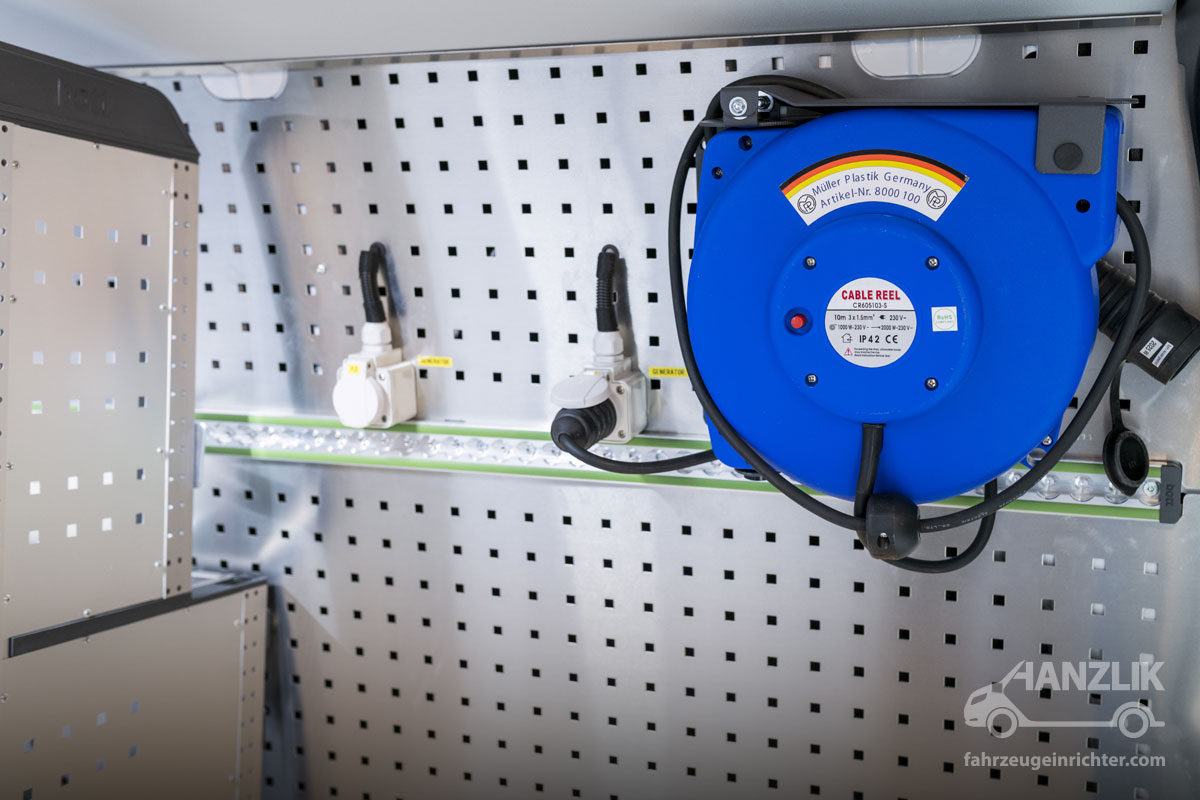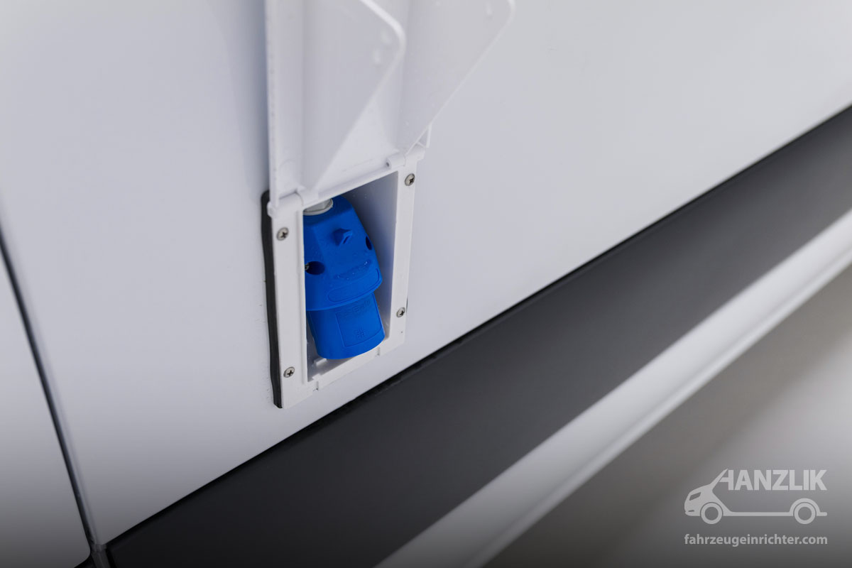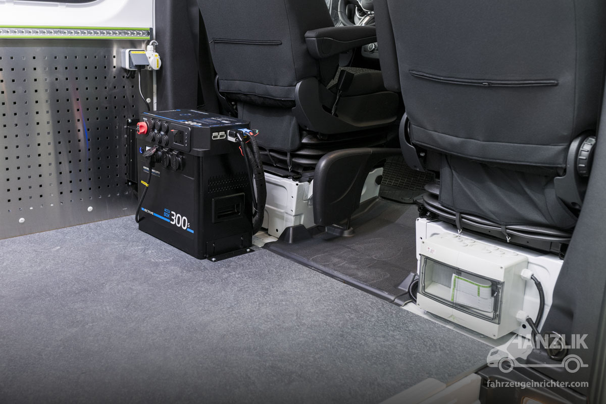 Die Stromversorgung übernimmt die Accubox von Ective. Sowohl 12V- als auch 230V-Leistungen stehen zuverlässig zur Verfügung. Ergänzt wird das System durch eine Außeneinspeisung, über die das Fahrzeug auch über Nacht geladen werden kann. So sind die Heizlüfter am Morgen sofort einsatzbereit und gewährleisten direkte Arbeitsbereitschaft.