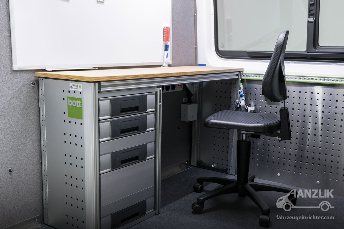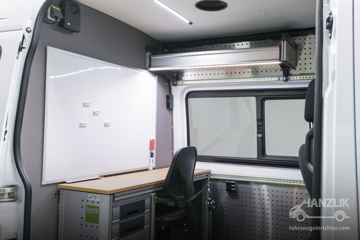Flexibilität beim Arbeiten ist die Grundvoraussetzung dieses Mercedes-Benz Sprinter 417 L2H2. Im vorderen Bereich entstand ein vollwertiger Arbeitsplatz für Planungs- und Schreibarbeiten, der unabhängig von äußeren Einflüssen genutzt werden kann. Stand- und Zusatzheizung sorgen jederzeit für ein angenehmes und konstantes Arbeitsklima.
