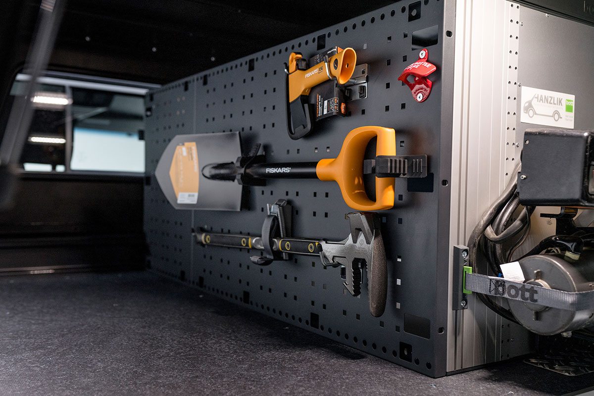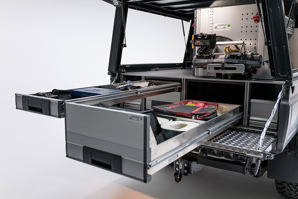 Für Fahrten in unwegsamen Geländen ist es besonders wichtig, dass alles sicher und fest verstaut ist. Gerade wenn im Wagen Werkzeuge und andere Hilfsmittel transportiert werden. In solchen Situationen ist eine vorschriftsmäßige Ladungssicherung das A und O. Kein Problem mit den Systemen von bott und der fachgerechten Montage von Hanzlik.