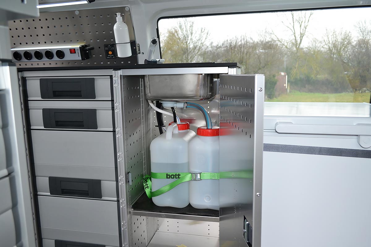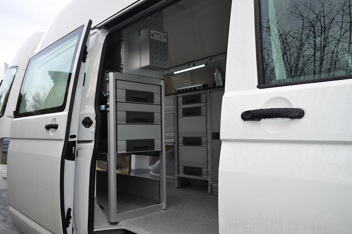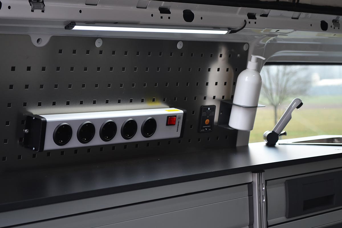 Um auch mobil die Bodenstoffe und Recycling-Materialien genau unter die Lupe nehmen zu können, wurde dieser VW T6 als mobiles Labor ausgestattet. Zudem bringt dieses Fahrzeug zwei vorteilhafte Merkmale mit – einen langen Radstand und ein Hochdach.